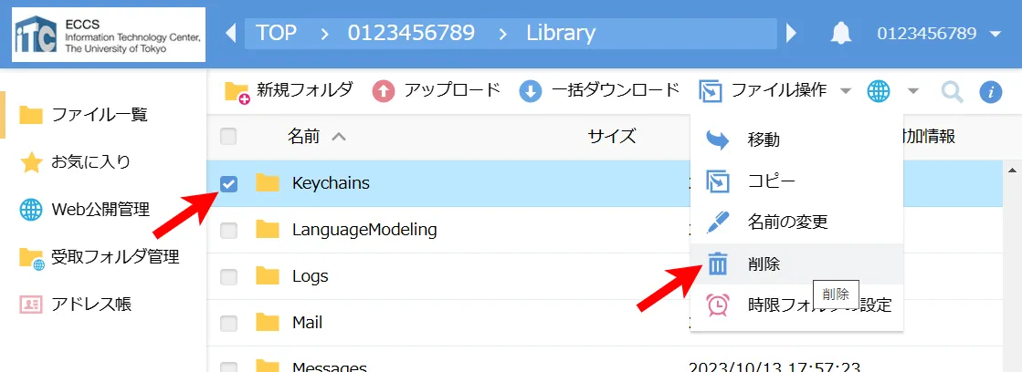 <共通ID(UTokyo Accountの先頭10桁の数字のみの部分)>/Library/Keychainsを選択し,削除してください.