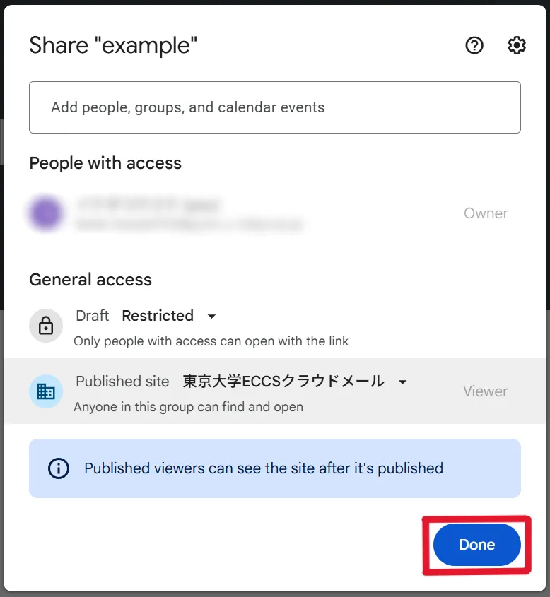 - If you select “The University of Tokyo ECCS Cloud Email”, only ECCS Cloud Email users will be able to view the site. Select this option if you want to limit the publication range to university members.