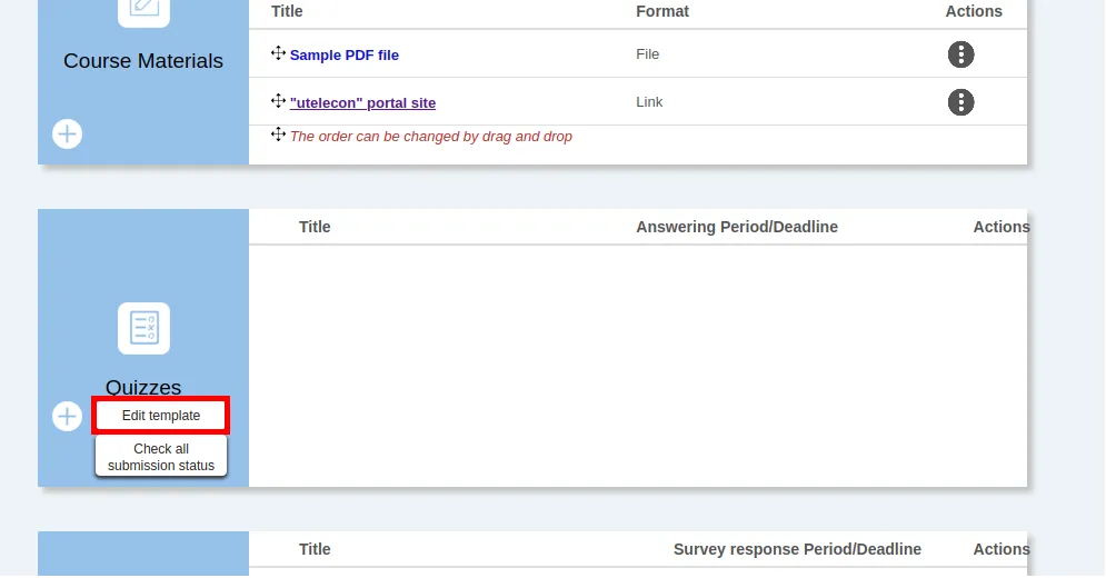 - On the “Course Top” screen, click the “Edit template” in the “Quizzes” column. The “Quiz Template list” screen will appear.