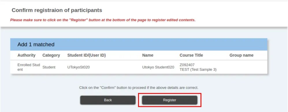 8. After reviewing the changes, click the “Register” button to add the users (authority) that are displayed.