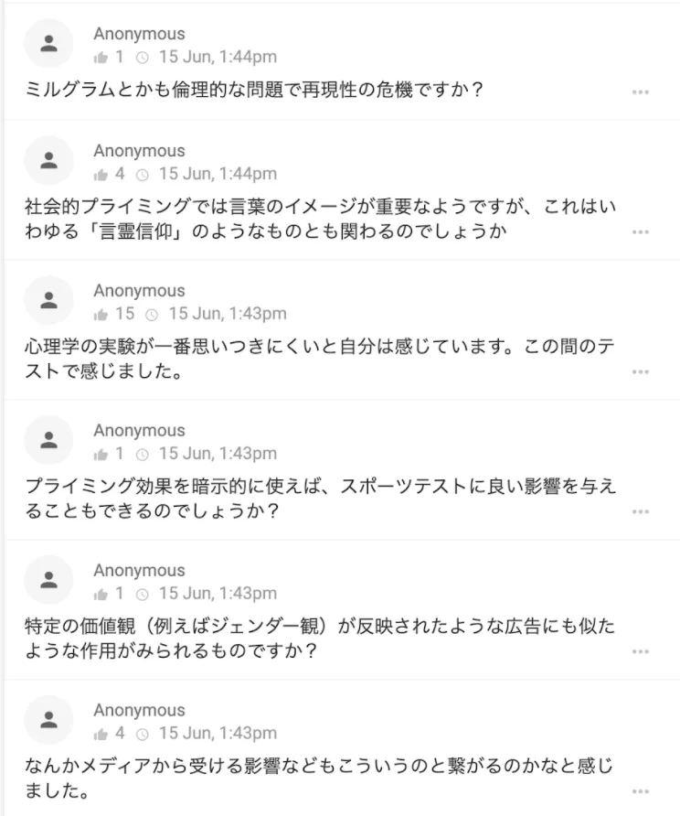学生にとって、匿名で同じ授業を受けている人との繋がりを持てたという点でとても良い機会だったのではないかと思います。私自身にとっても、オンライン授業になってから授業以外で学生と触れ合うことのできる機会がなくなっていたため、学生の人間味を感じられるいい機会になりました。