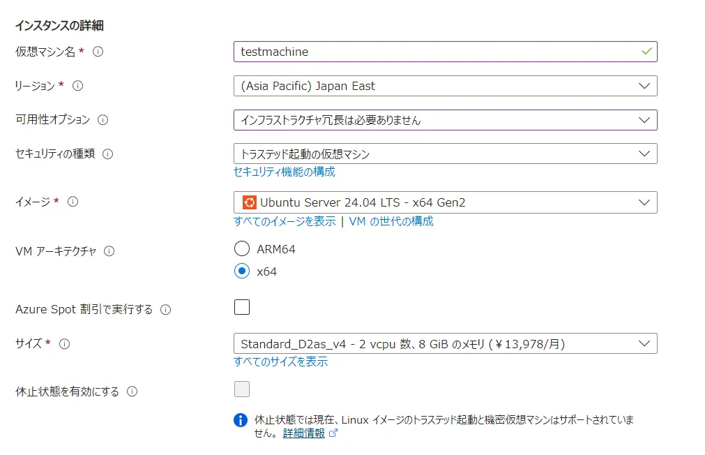 testmachineと入力しています. - リージョン:仮想マシンをどの地域(リージョン)にあるデータセンターにデプロイするかを指定します.使いたい機能が特定の国のリージョンにしかない場合は,その国のリージョンを選択ください.海外のパブリッククラウド上での情報管理に不安がある場合は日本国内(