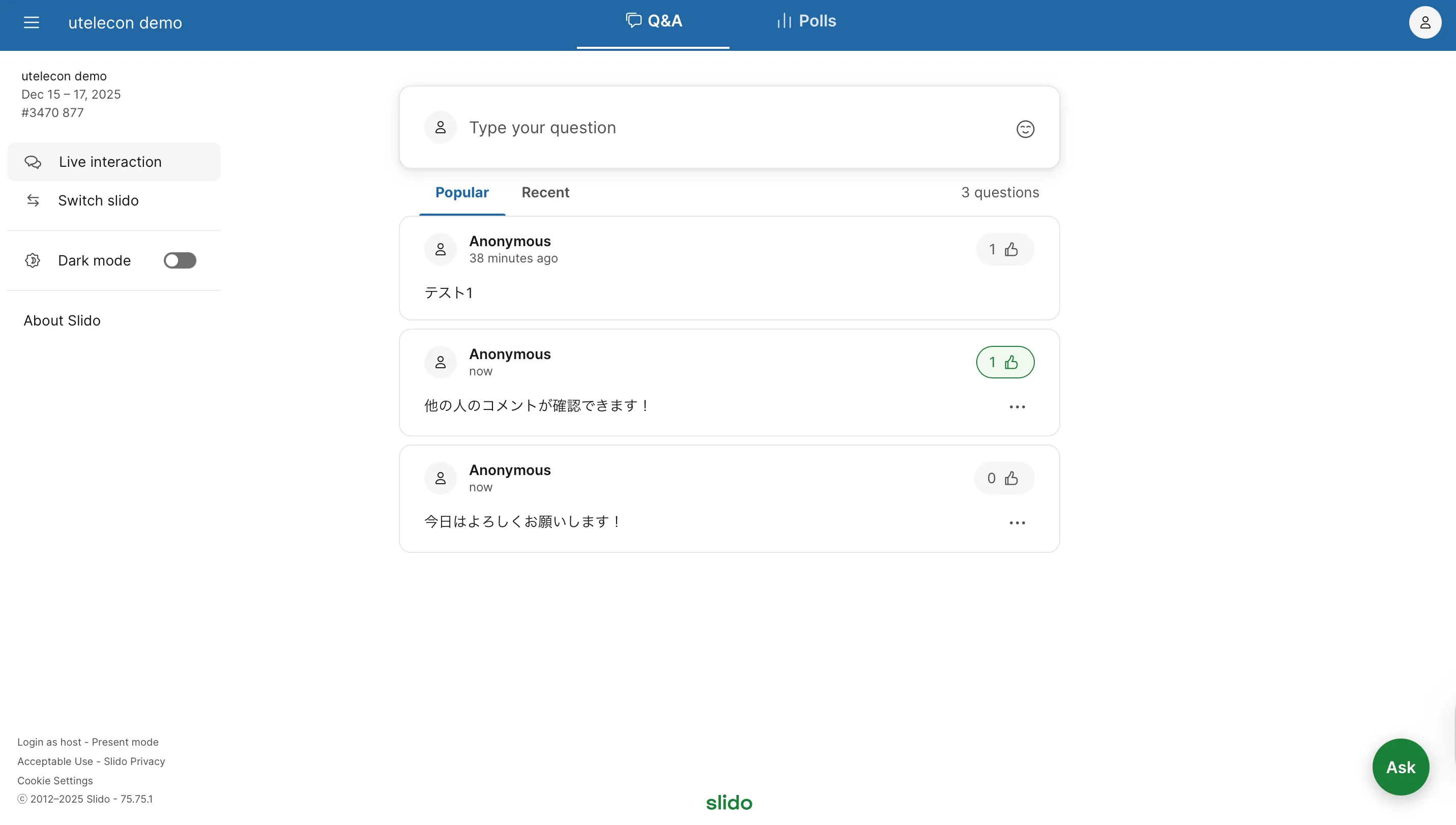 Slidoの画面でどのようなことができるかについては,「Slidoで受講者ができること」をご覧ください.