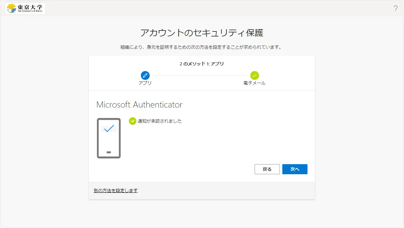 手順を終えると,その後UTokyo Accountにサインインする際,毎回,設定したSMSや専用のアプリなどで本人確認することが求められます.登録した本人確認方法(スマホのアプリや電話番号)が利用できない状態ではUTokyo Accountにサインインすることができなくなりますので,十分ご注意ください.