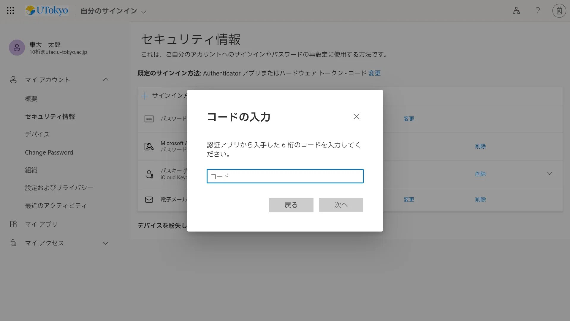 UTokyo Accountでサインイン時(パスワード入力後)に,デフォルトの本人確認方法で多要素認証の本人確認を行う画面が表示されますが,その画面で以下のように操作してください.