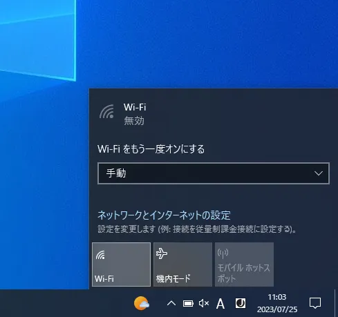 タスクバーの中から地球儀の形をしたアイコンを選択し,その中から扇型の「Wi-Fi」アイコンを選択してWi-Fi機能をオンにしてください. もし,タスクバーの中に地球儀アイコンがなく扇型の「Wi-Fi」アイコンがある場合は,単にそれを選択すれば結構です.