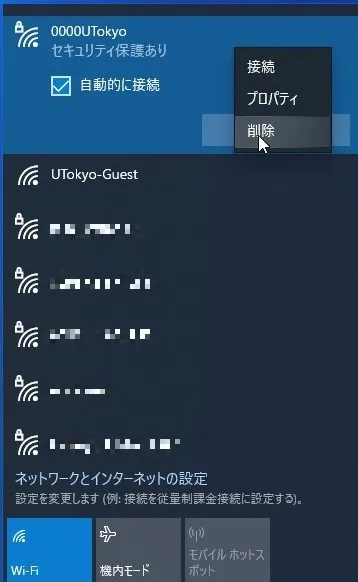 手順2で見つけたSSIDを右クリックし,表示されたメニューの中から「削除」を選択してください.