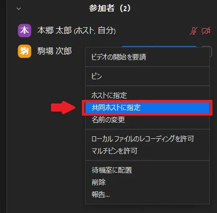3. 表示されたケバブメニュー(「…」のアイコン)をクリックし,「共同ホストに指定」を選択してください.