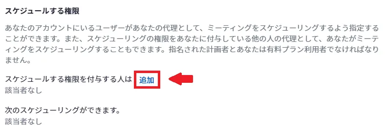 2. 「ミーティング」タブを選択し,「その他」欄の「スケジュールする権限」まで移動し,[追加]を選択してください.