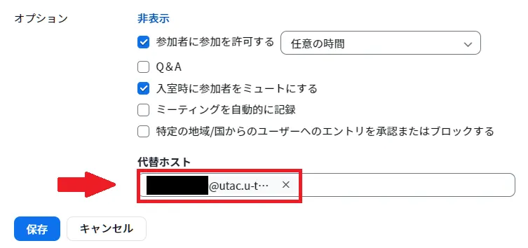 4. 「代替ホスト」欄に,追加対象のユーザーのUTokyo Account(数字10桁の共通ID + @utac.u-tokyo.ac.jp)を入力してください.