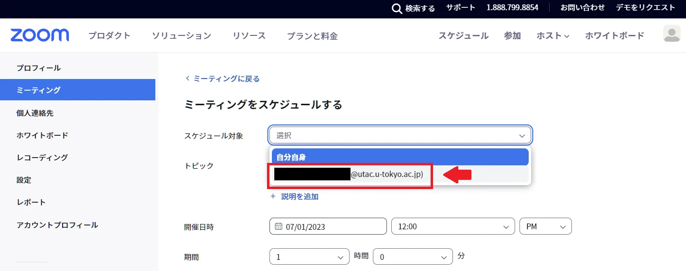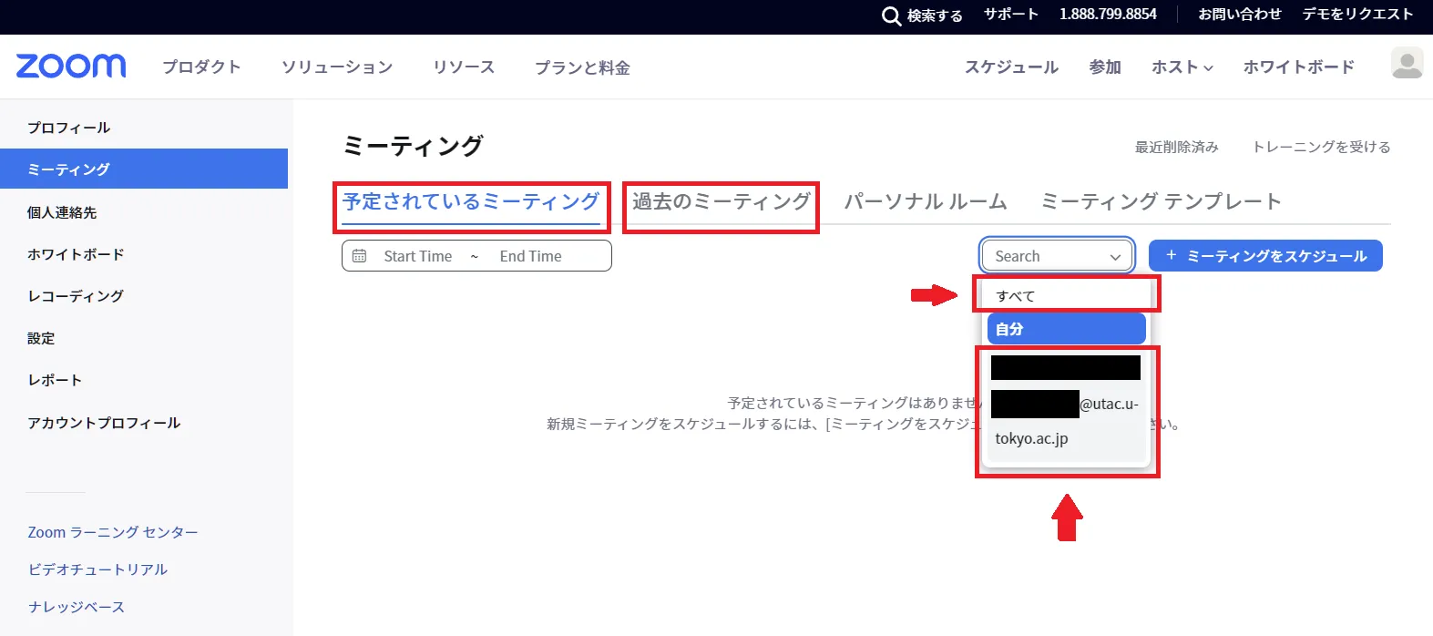 2. 「ミーティングをスケジュール」の左側にあるプルダウンメニューから,「すべて」もしくは親ユーザーを選択してください.「すべて」を選択した場合は自分自身のミーティングと親ユーザーのミーティングの一覧が,親ユーザーを選択した場合は親ユーザーのミーティングの一覧が表示されます.