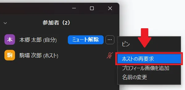 ホストが他の参加者に移動したあと(ホストの譲渡ホストキーの使用ホストの退出ホストの意図しないミーティング離脱などによる),元々のホストが再びホストに戻ることを希望する場合は,以下の手順でホストを回復することができます.この機能を実行できるのは,自分自身のミーティングについてのみであり,たとえば「代替ホスト」を設定されたことで他者のミーティングのホストになっていた場合は実行することはできません. ミーティング中の「参加者」欄に表示されている自身の名前にマウスを合わせ,表示されたケバブメニュー(「…」のアイコン)をクリックし,「ホストの再要求」を選択することで,再びホストに戻ることが可能です.